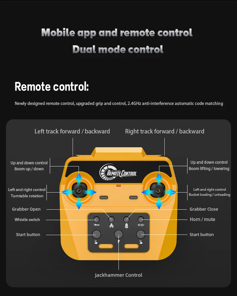 1. التحكم الكامل في التناسب، للأمام / للخلف، دوران 360 درجة في اتجاه عقارب الساعة / دوران 360 درجة عكس اتجاه عقارب الساعة، يتم تشغيل أذرع الحفر الكبيرة والصغيرة بشكل منفصل للارتفاع والهبوط، كما أن دلو الحفر قابل للفصل (المنتج مزود بثلاث ملحقات دلو حفر، والتي يمكنها تغيير نوع الماكينة)