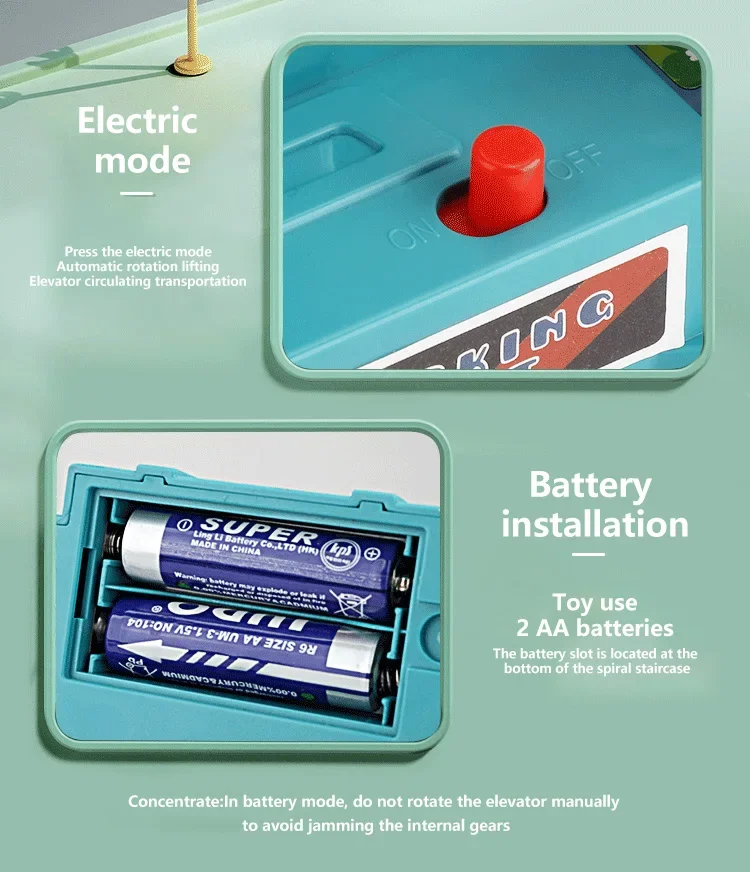 • مصادر الطاقة المتوافقة - تتطلب بطاريتين AA لموقف السيارات، والمنارة، وقاعدة المصعد (البطاريات غير متضمنة)