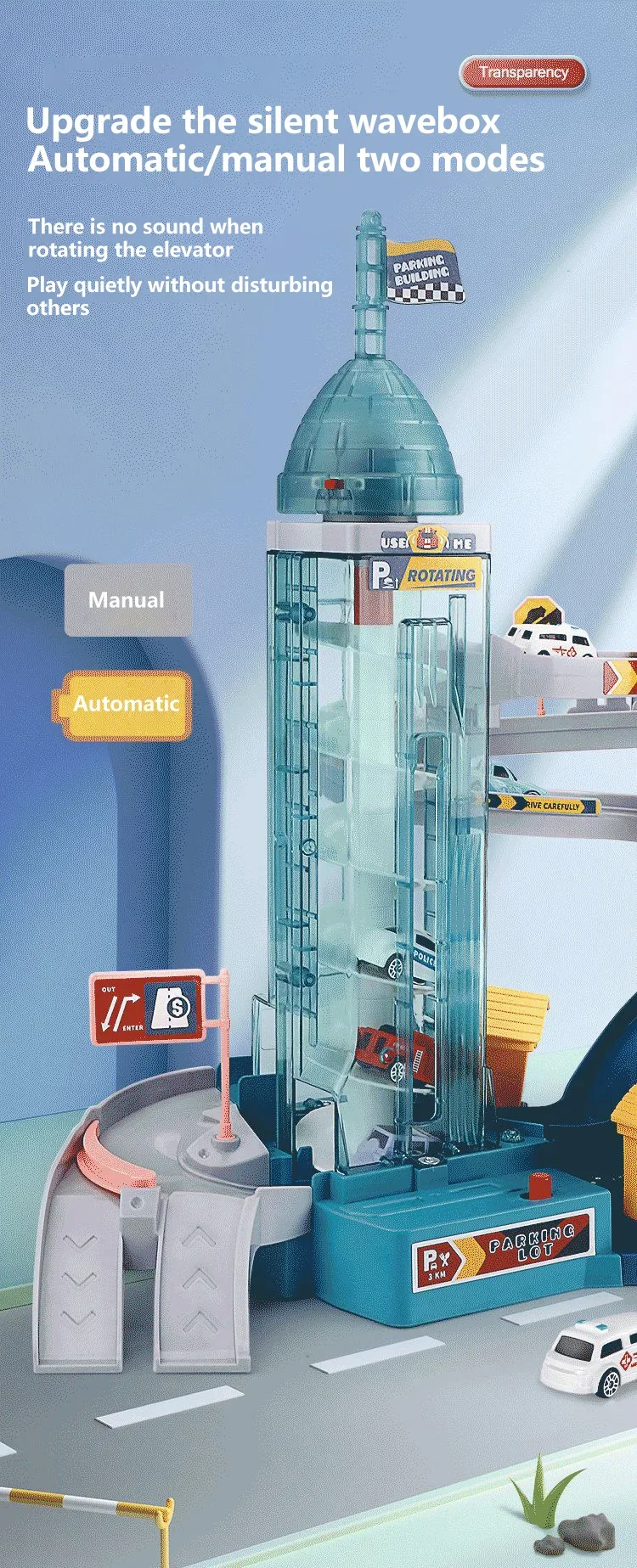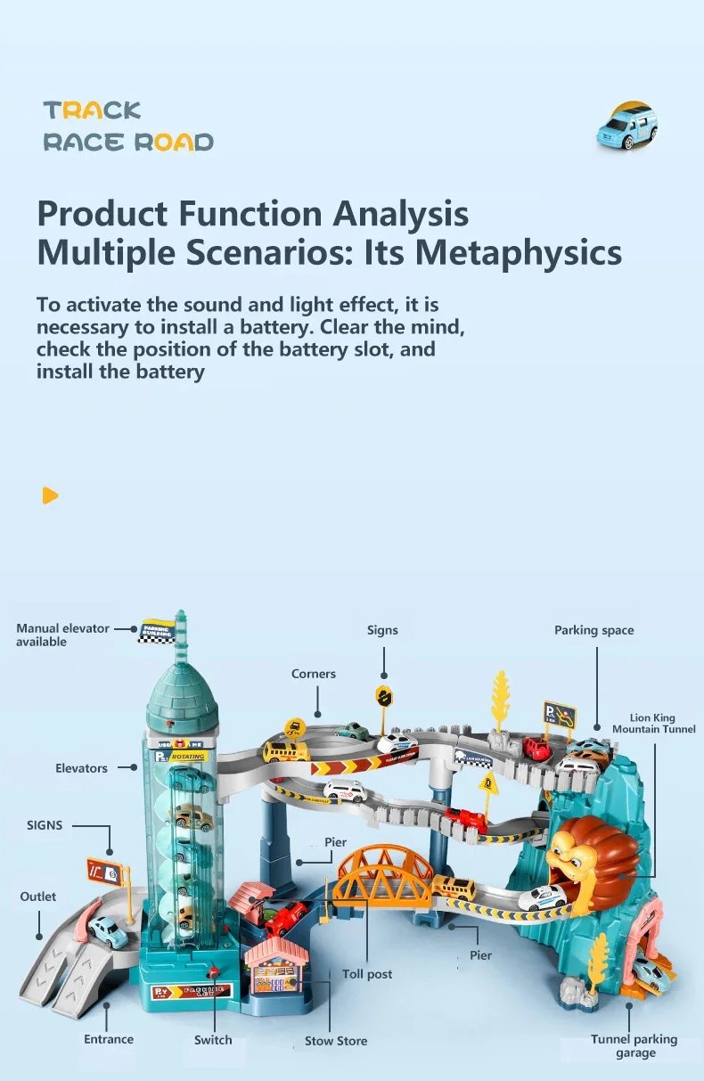 • ملحقات اللعب الغنية - 4 سيارات صغيرة، ومسار صخرة الأسد، وقاعدة مصعد، ومحطة خدمة طريق سريع بالمدينة، وموقف سيارات لمشاهد متنوعة